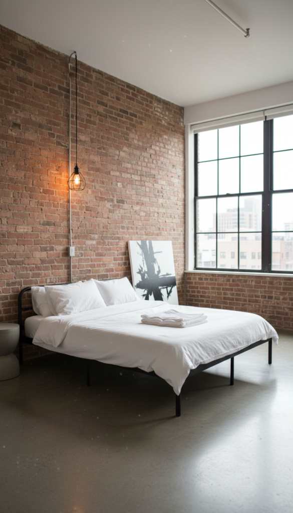 Stick to a monochromatic color palette of greys, blacks, and whites. Use metal piping for clothes rails or shelving units. Choose bedding in solid, neutral tones—crisp white linen works beautifully against rough brick.