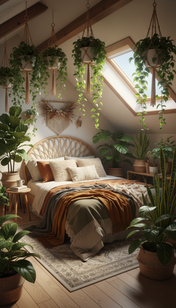 Layer rugs with different textures (jute, wool, or faux fur) on the floor. Hang trailing plants like pothos or ivy from the ceiling or place them on high shelves to draw the eye upward. Use rattan or wicker storage baskets to hide clutter.