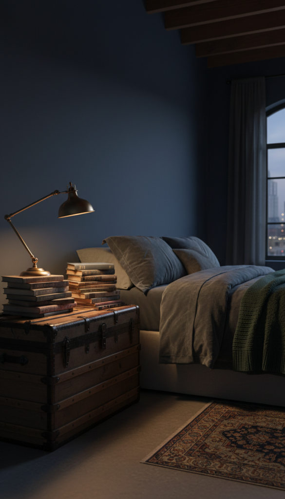 Paint the walls a deep navy, forest green, or charcoal. Thrift for vintage wooden nightstands or a trunk for storage. Stack books creatively as decor and use brass or gold lamps to create pools of warm light.