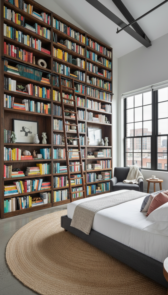In a loft, vertical space is your greatest asset. Turning a wall into a library not only provides storage but acts as a stunning focal point that draws the eye up, emphasizing the height of the room.