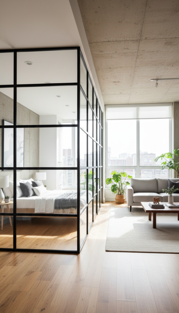 Use room dividers that allow light transparency. Crittall-style glass partitions, open shelving units filled with books and plants, or light, sheer curtains are excellent options.