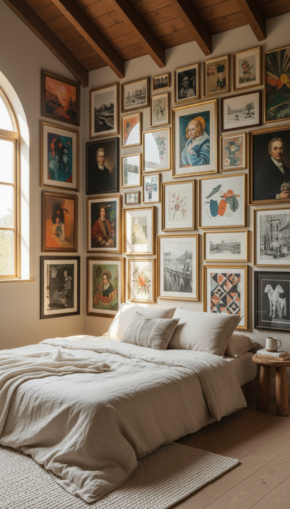 Treat your sleeping area as an exhibition space. In a small room, walls are prime real estate. A gallery wall adds intense visual interest and personality without taking up a single inch of floor space.