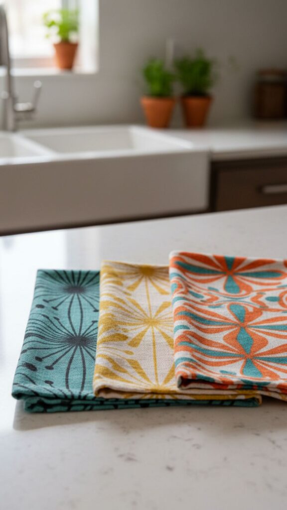 Textiles are an easy and affordable way to inject mid-century flair without a major renovation. The era was famous for its playful use of geometry—think boomerangs, stars, and abstract shapes. A set of high-quality dish towels featuring these atomic prints can brighten up an oven handle and tie the whole room together.