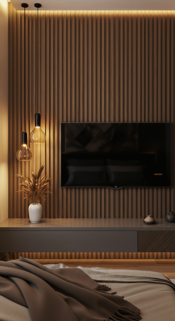 When you cover the entire wall behind the TV using vertical slats or ribbed wooden panels, the room instantly feels taller. This is the trick small bedrooms often use to add visual height.