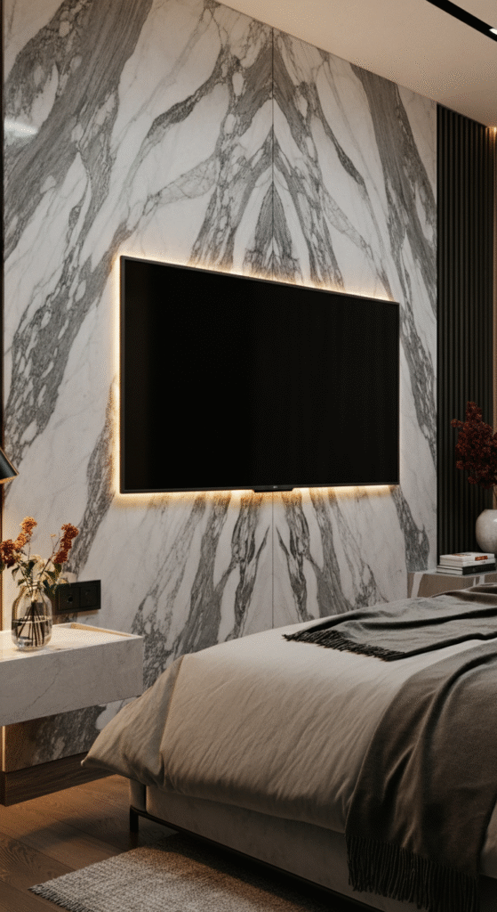 If you want a luxurious bedroom vibe without overdoing anything, a marble accent TV wall works beautifully. It has a clean natural pattern that never competes with your furniture.