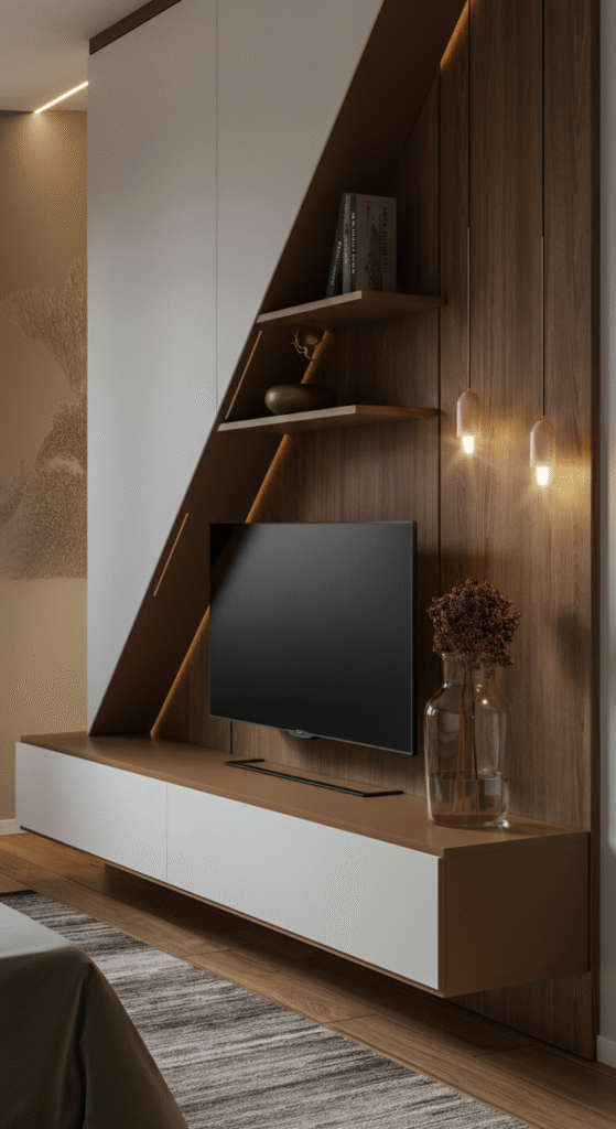 9. Modern TV Wall With Mixed Materials and Layered Depth