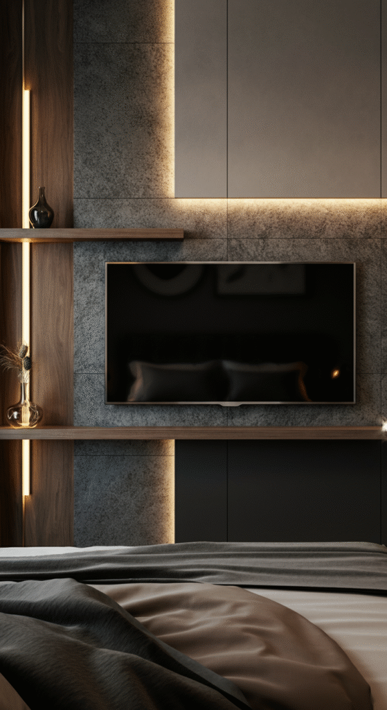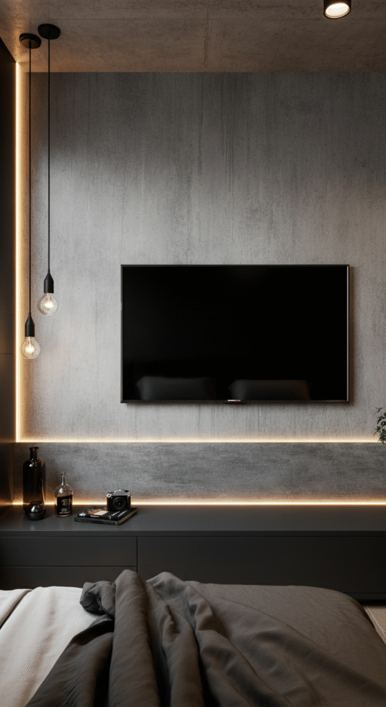 When you hang a slim black TV on a soft grey concrete wall, the contrast is almost cinematic. Add a narrow LED strip and the whole wall feels like a modern art installation.
