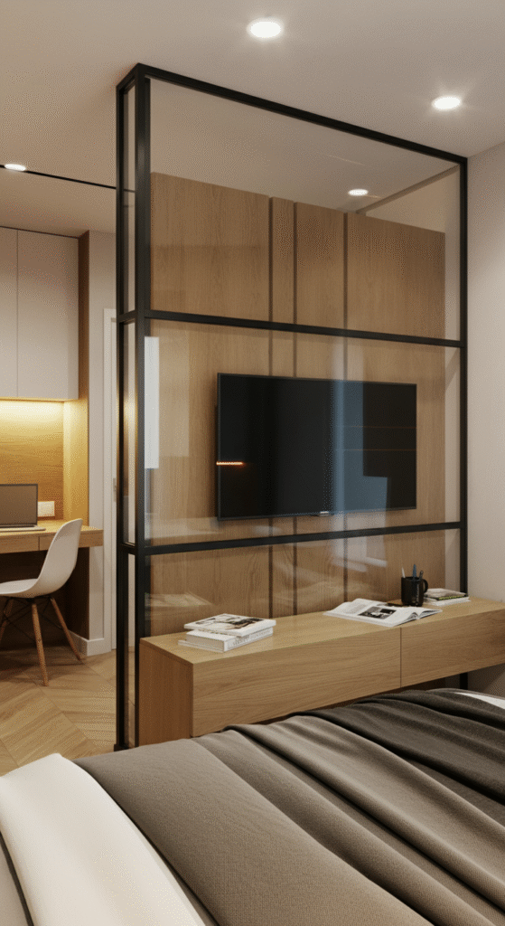 This makes the bedroom look more expensive and structured. It is also perfect for studio apartments where zoning is necessary without making everything feel closed off.