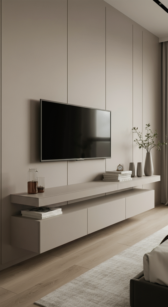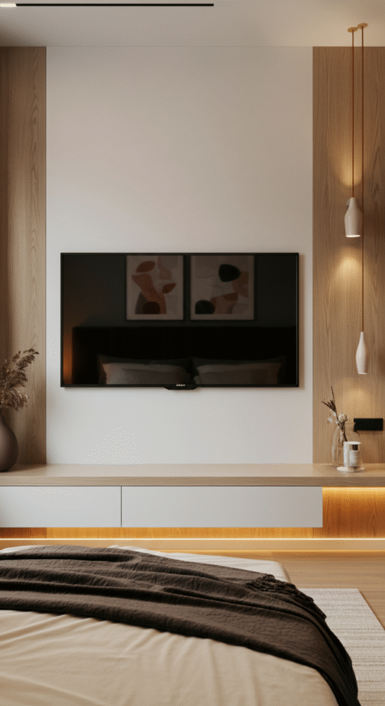 A floating console beneath the TV is simple, practical, and stylish for modern bedrooms. It balances the composition and hides everyday essentials like remotes, routers, chargers and small decor pieces.