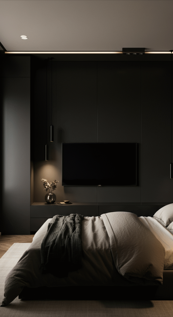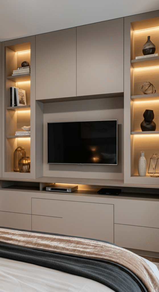 This design makes the TV look like part of the architecture, not a separate object. It is especially useful for medium to large bedrooms where you want function and style together.