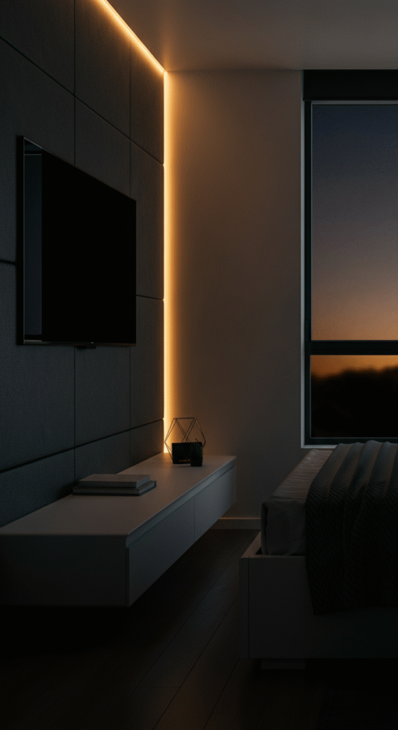 Adding soft LED lights behind the TV wall gives a magical glow effect at night. It feels cozy and cinematic. LED lighting also reduces eye strain while watching TV in a dark room.