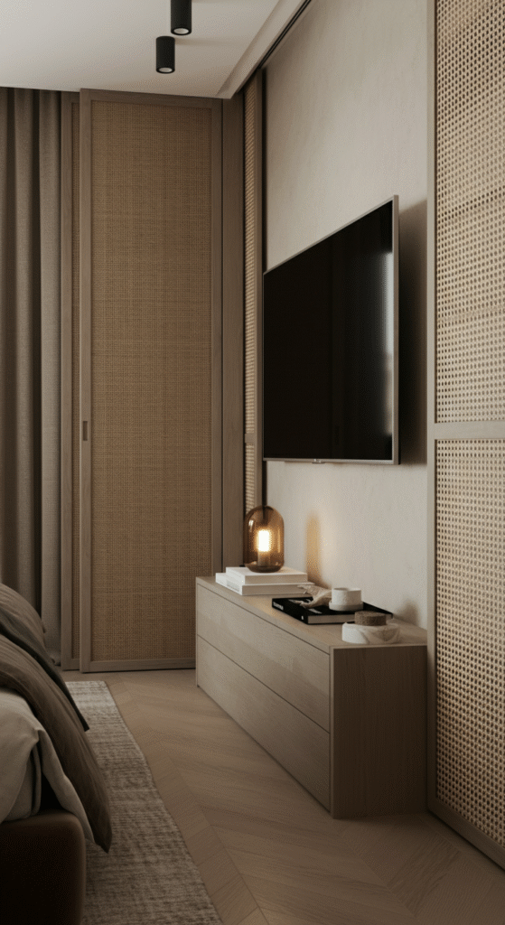 If you want the bedroom to feel like a calm, tech free sanctuary, hiding the TV behind sliding panels is a smart move. You can choose panels made from wood, cane, mirror, or upholstered finishes.