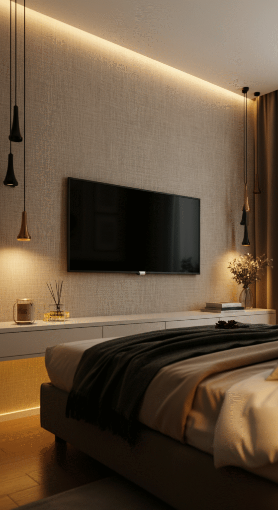 Wallpaper also reduces the visual sharpness of the TV, blending it into the design. It is one of the easiest and fastest upgrades for a stylish bedroom TV wall.