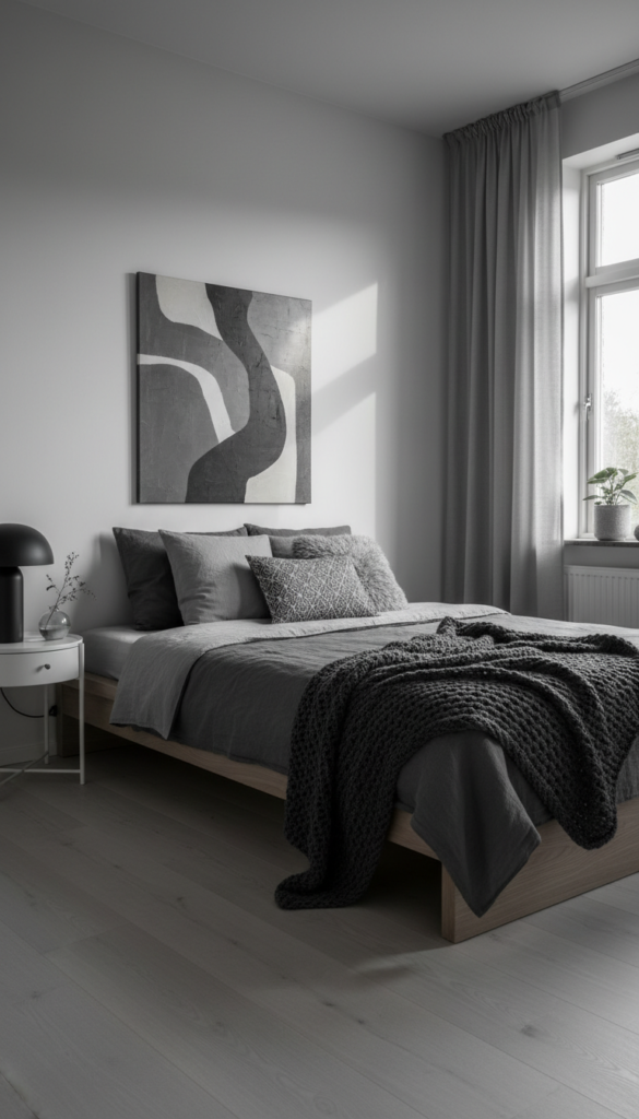 Start with a base of varied greys to create depth without visual noise. This approach relies on layering different shades of the same color family to prevent the room from feeling flat or clinical.