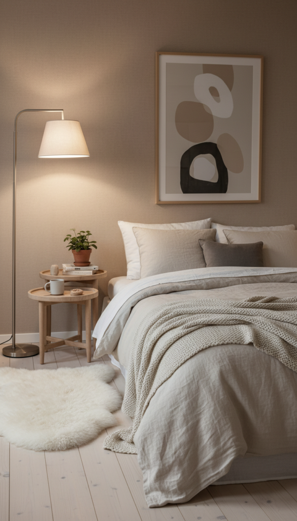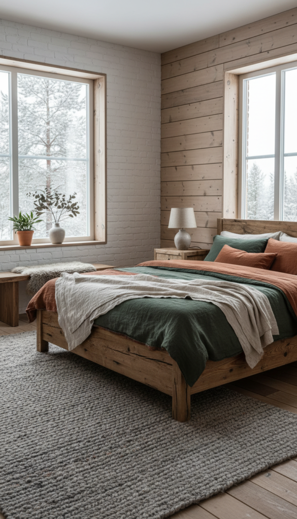 Texture is the secret weapon. Layer chunky knit blankets, linen bedding, sheepskin rugs, and warm wood tones to ensure the room feels inviting rather than sterile.