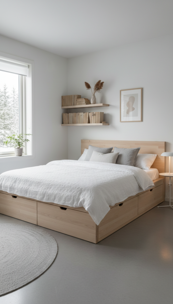 Space is often at a premium in Nordic apartments, making functionality key. A platform bed with integrated storage reduces clutter, keeping the visual space clean and calm.