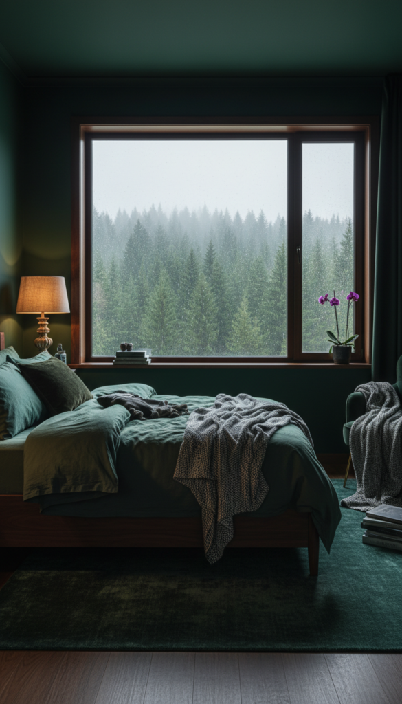 - Color Palette: Emerald green, moss, charcoal, and deep walnut brown.