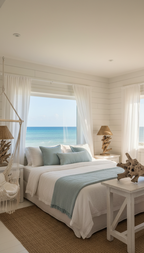 - Accents: Driftwood mirrors, sea glass vases, and woven baskets.