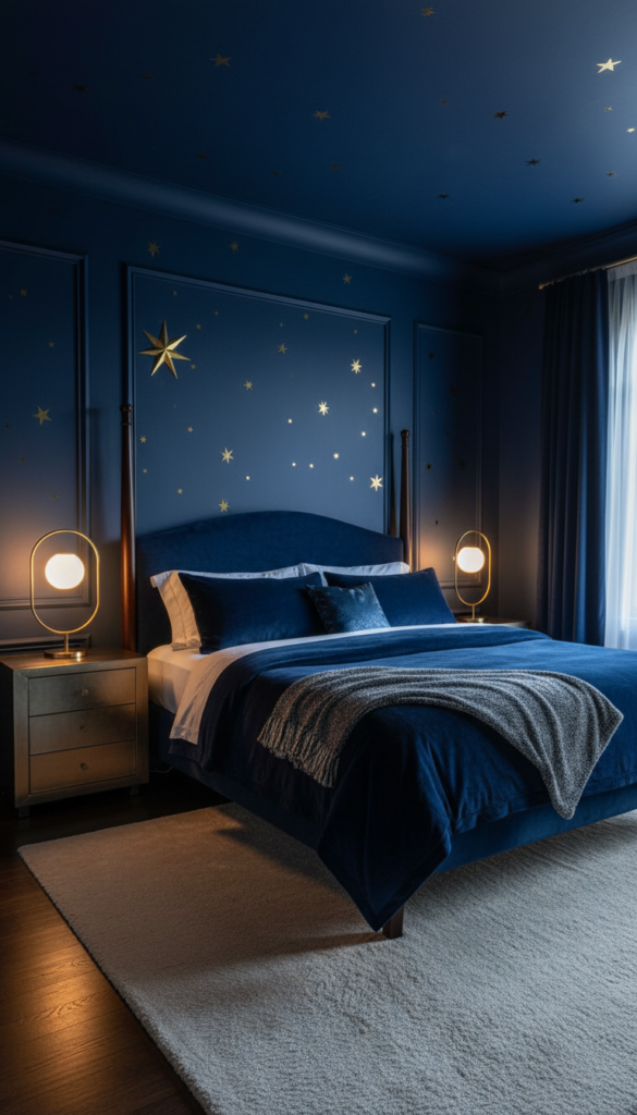 - Color Palette: Midnight blue, indigo, black, and metallic gold or silver.
