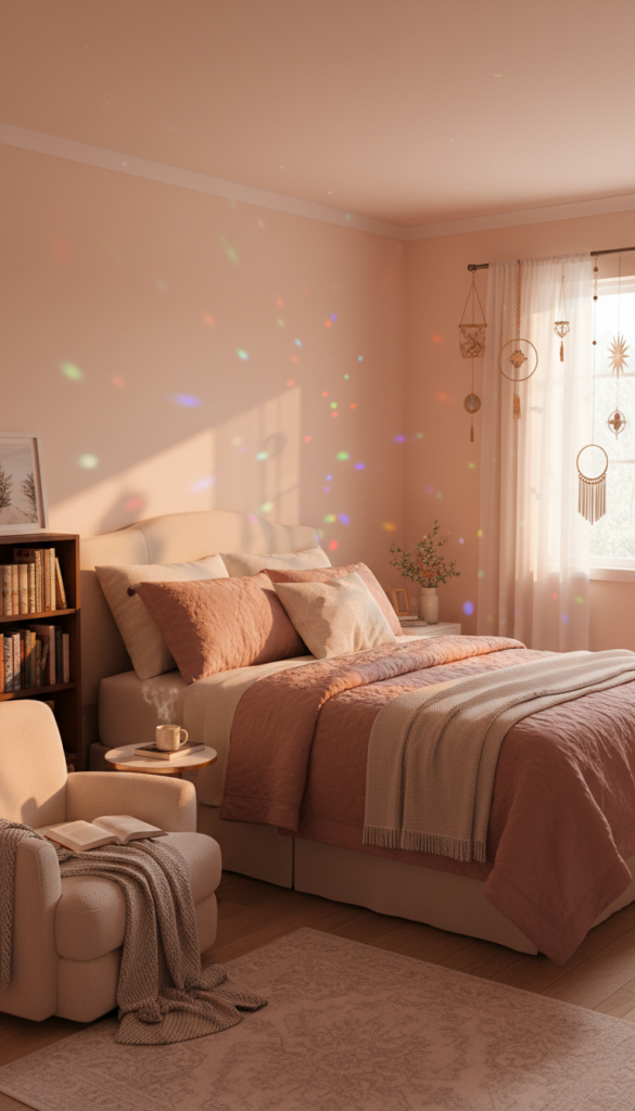 - Lighting: Salt lamps, amber-tinted bulbs, and sun-catchers in the window.