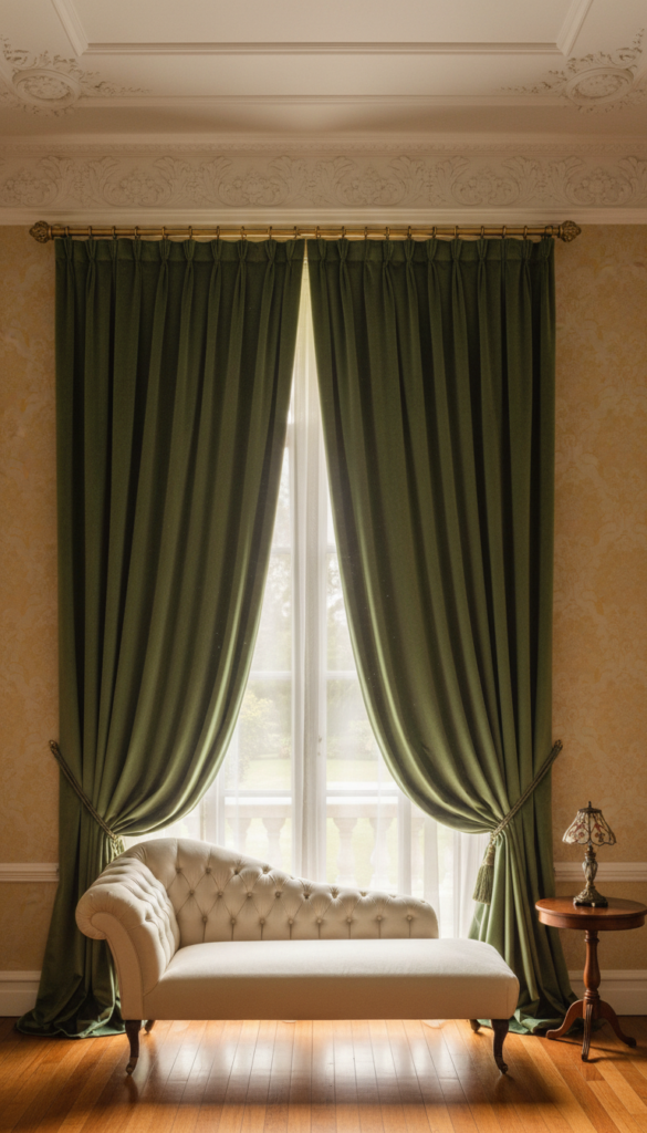 Window treatments in heritage homes are never an afterthought. They are substantial, functional, and dramatic. Flimsy blinds or short curtains that barely cover the window frame will break the illusion of luxury.