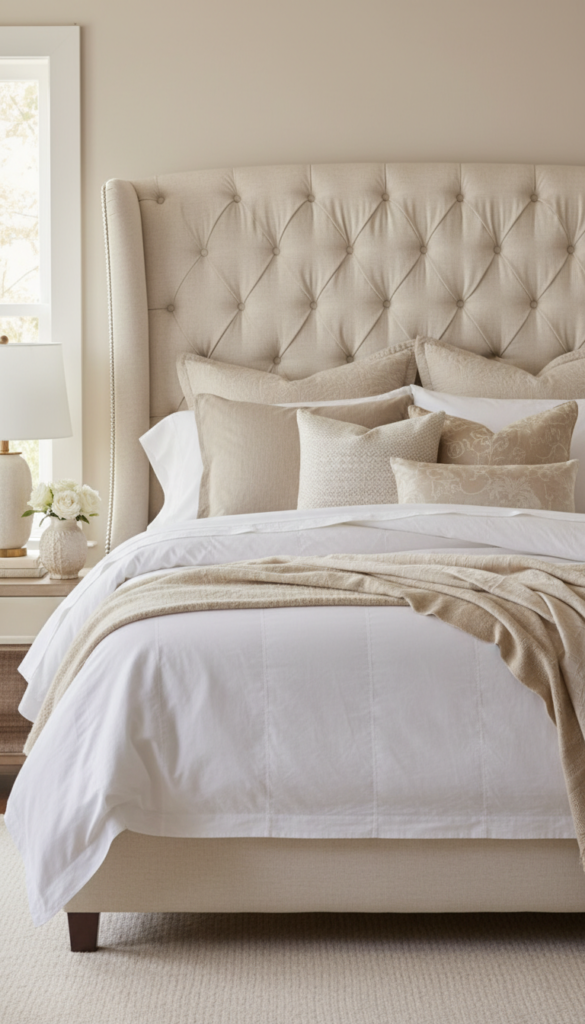 • Opt for a tall, tufted headboard in a neutral fabric like linen or velvet.
