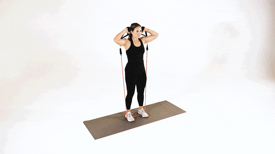 - Stand on the band with feet shoulder-width apart, hold the ends with straight arms.
