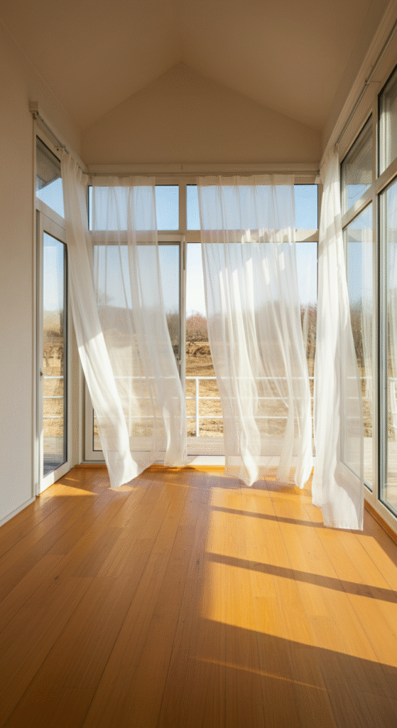 Window Treatment Tip: Opt for sheer white or light-colored curtains that allow light to pass through without compromising your privacy. For a more modern look, consider blinds in a light wood finish to complement the minimalist design.