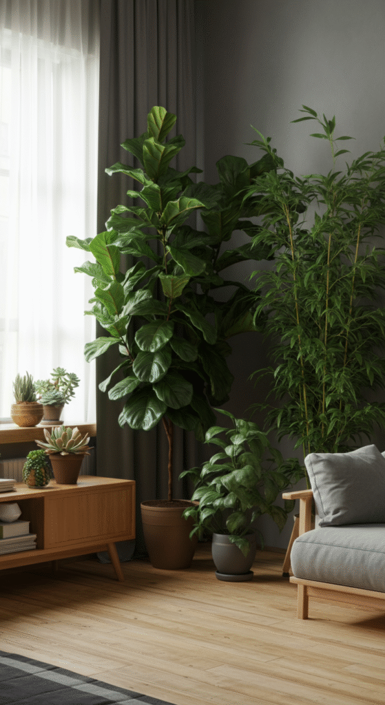 Plant Ideas: Incorporate hardy, low-maintenance plants like succulents or snake plants, which are both visually appealing and practical. A statement piece like a fiddle-leaf fig tree or a bamboo plant in the corner can also provide a touch of nature without overwhelming the space.
