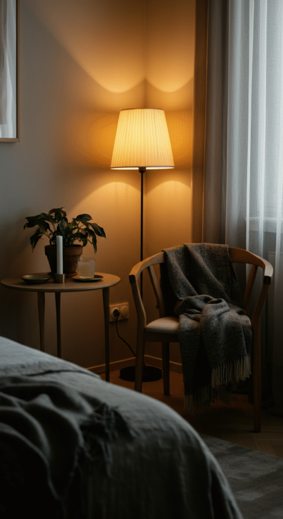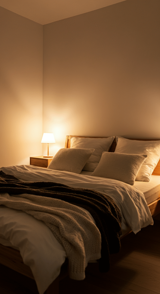 Use warm lighting, soft fabrics, a few candles, and keep the room clutter free for a calmer mood.