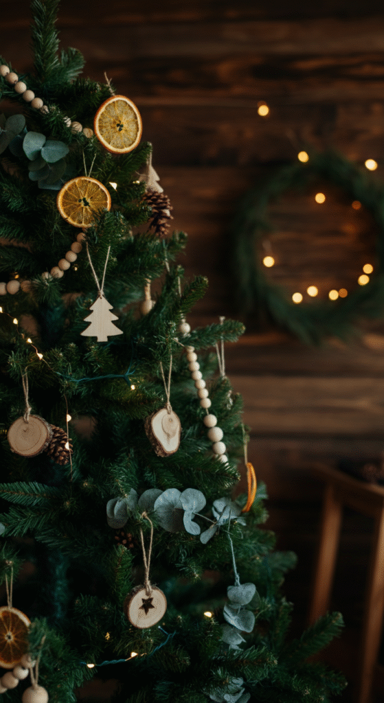 You can use wooden or bamboo ornaments, dried oranges, pinecones, and even sprigs of eucalyptus to adorn the tree. Instead of traditional tinsel, consider draping the tree with natural twine or using wooden beads. This look feels relaxed and inviting, giving your home a cabin-in-the-woods vibe.
