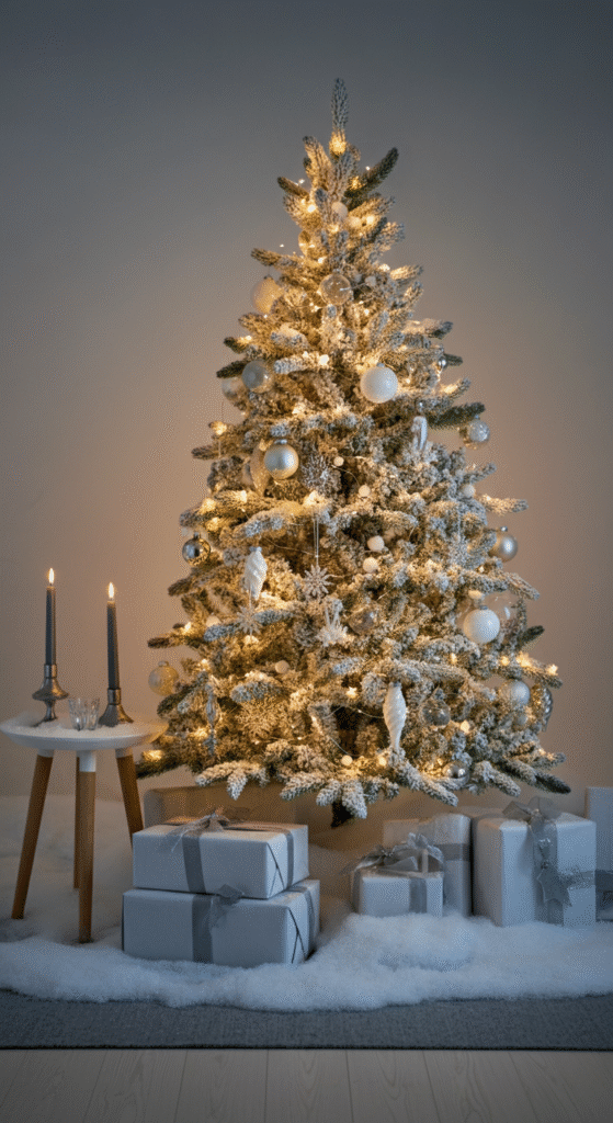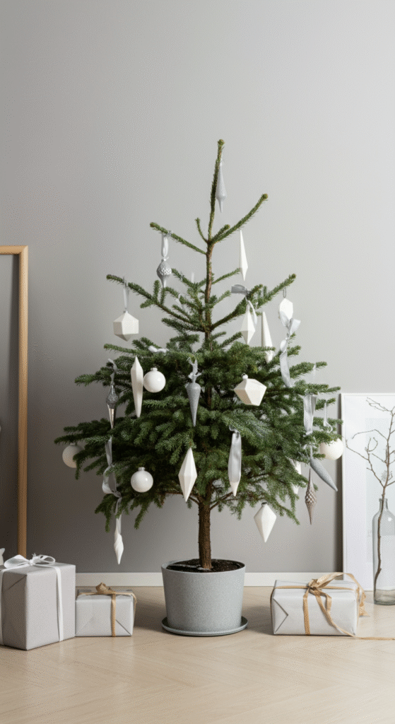 Opt for a small or medium-sized tree, perhaps one with a very sparse arrangement of branches, and keep the decor to a minimum. Use a monochromatic color scheme—think whites, silvers, or soft greys—and choose sleek, modern ornaments such as geometric shapes or metallic accents. The focus here is on subtlety and elegance.