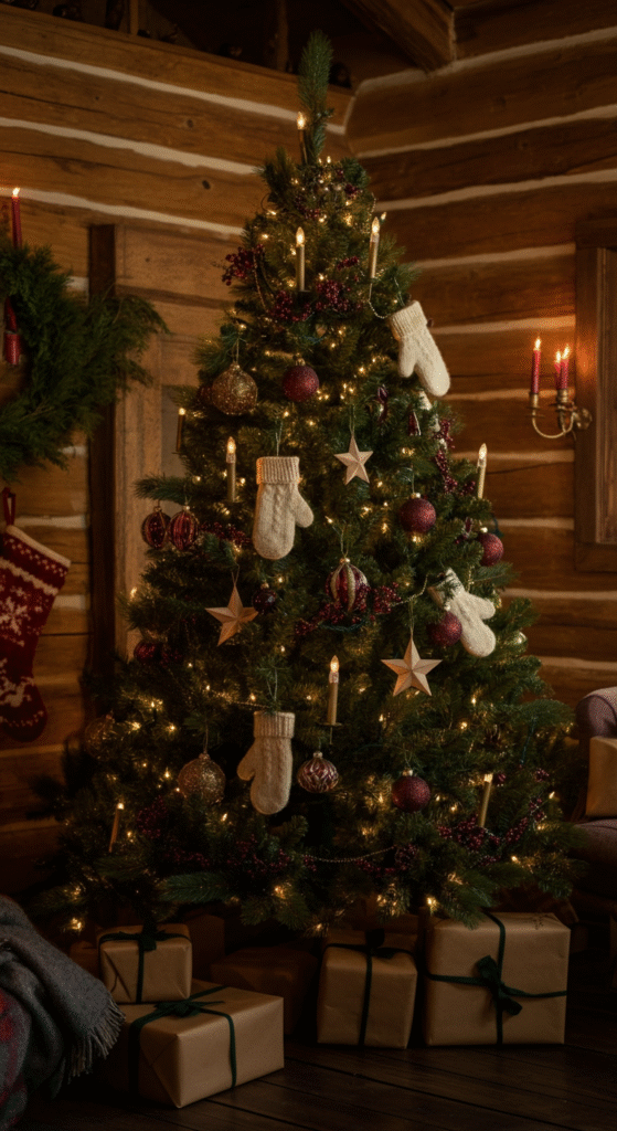 Imagine curling up in front of a crackling fire with the scent of pine filling the air. This cozy retreat-style Christmas tree is all about warmth and nostalgia, inspired by the Scandinavian cabins dotted across the countryside. Start with a full, lush tree and decorate it with rich, earthy tones like deep reds, forest greens, and golden accents.