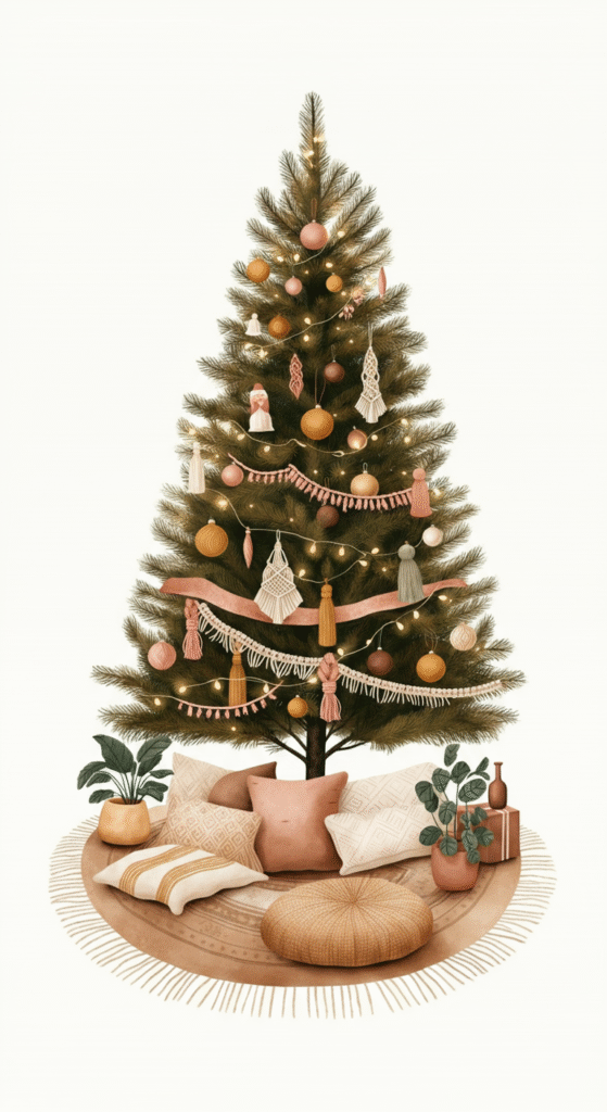 Think of pairing a classic green tree with boho elements like macrame ornaments, tasseled garlands, or vintage glass baubles. Choose a soft color palette of muted pinks, mustard yellows, and browns to create a look that feels both stylish and homey. Add some soft fairy lights for extra warmth, and you have a tree that’s as unique as your personality.