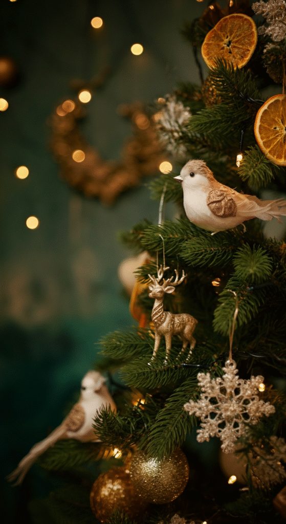 Start with a traditional full-sized tree, then adorn it with whimsical creatures like faux birds, reindeer, and even fairytale-inspired ornaments like glass snowflakes or tiny animal figurines. Gold accents can add a touch of glamour, and soft, warm lighting will create a magical glow around your tree.