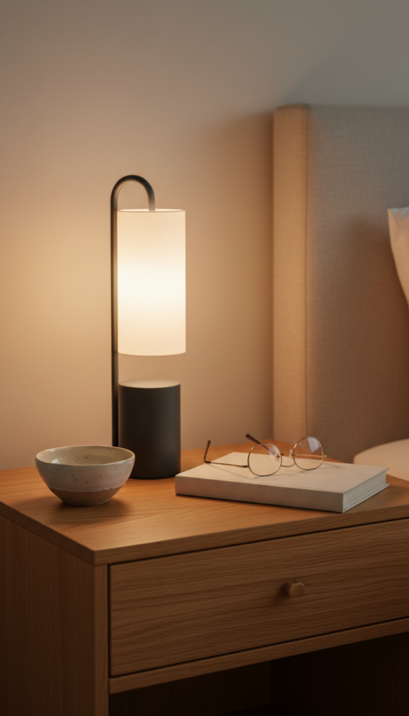 Luxury spaces are defined by what isn’t there. A nightstand covered in water glasses, phone chargers, and receipts looks chaotic. A curated surface implies that you have the space and time to prioritize aesthetics over clutter.