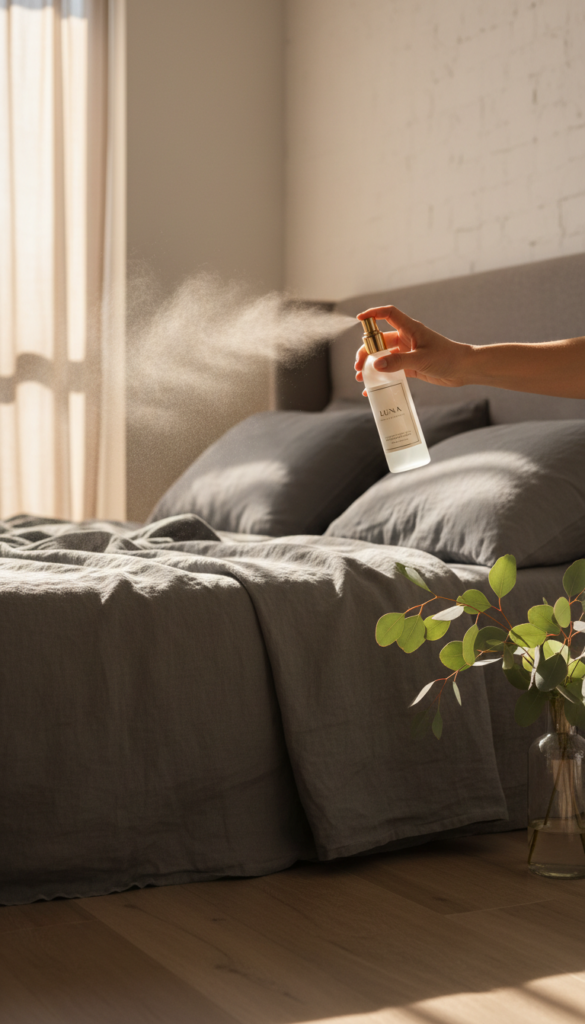 - Lightly mist your pillows and duvet after making the bed.