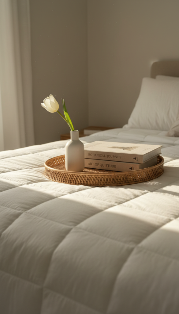 - Place a wooden, marble, or woven tray at the foot of the bed or on a bench.