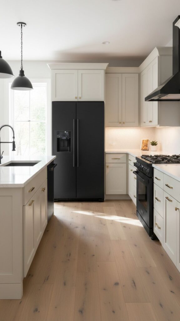 There is something undeniably sophisticated about matte black. It offers a striking contrast against white or light wood cabinets, grounding the space without adding visual clutter. The lack of shine ensures the look remains understated and modern.