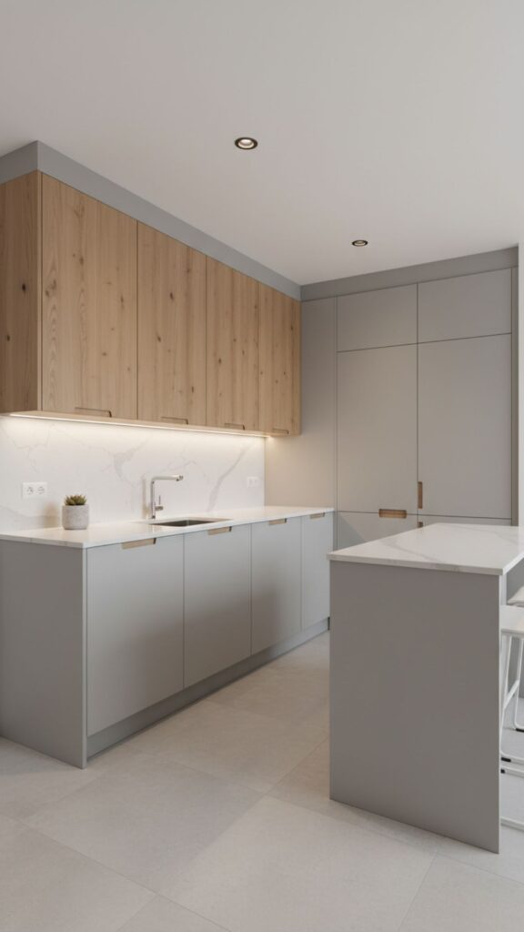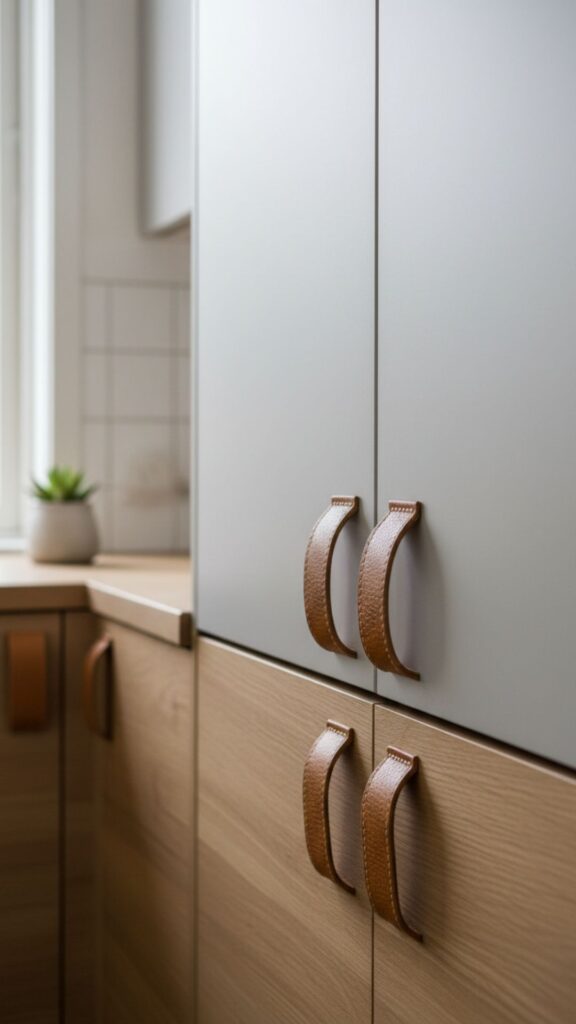 For a touch of texture and warmth, leather tabs are a unique minimalist choice. They soften the hard edges of cabinetry and age beautifully over time. This trend pairs exceptionally well with natural wood or painted gray cabinets.