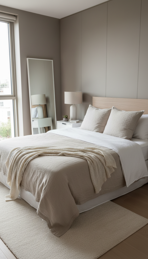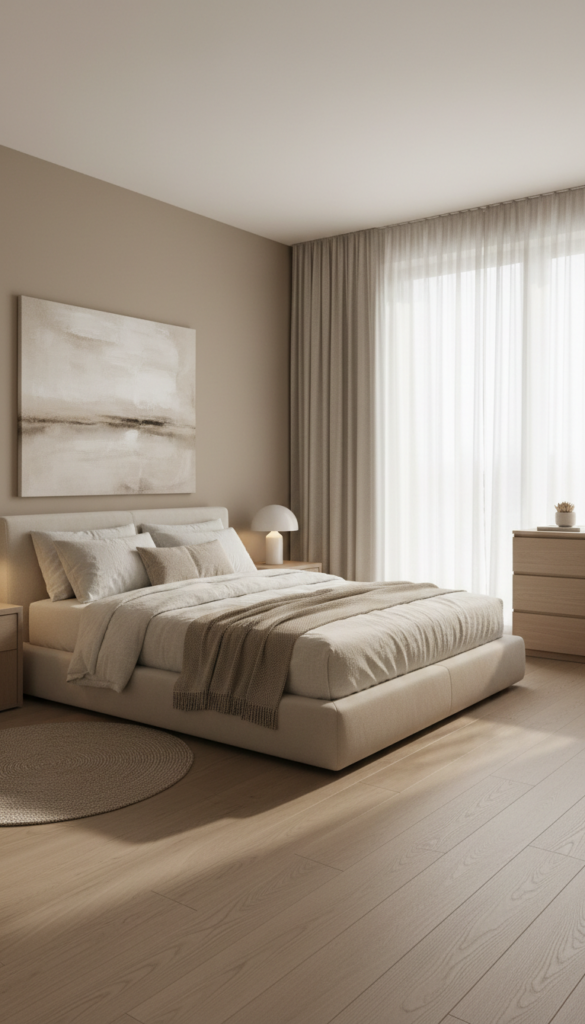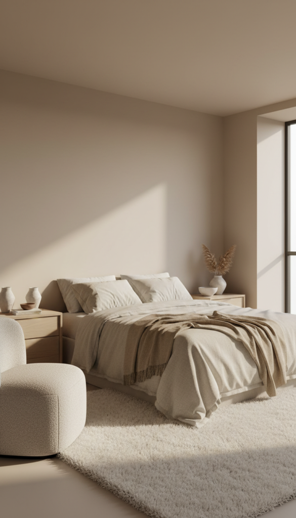 Think warm whites, creamy beiges, soft taupe, muted sand, and gentle greige tones. The magic is in layering similar shades rather than using just one color everywhere.