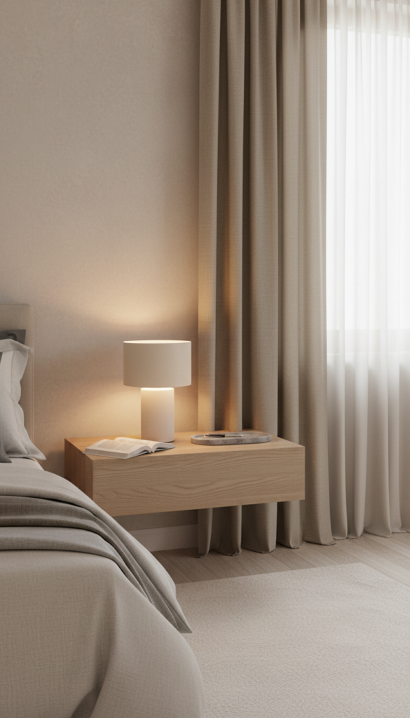 Nightstands in modern clean girl decor are functional but visually quiet. Floating nightstands or slim legged tables work best.