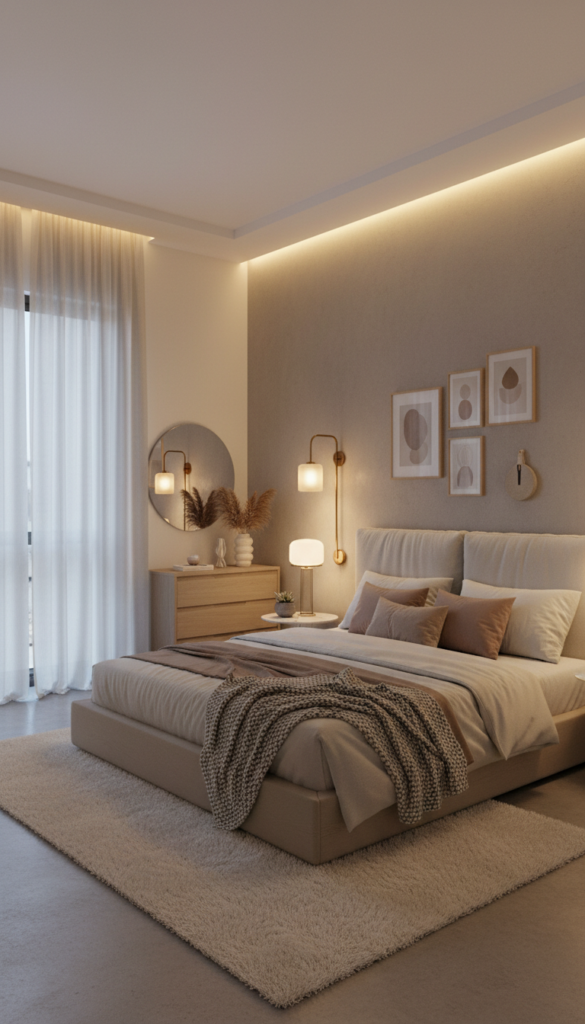 Add warm toned bedside lamps, wall sconces, or a small floor lamp with soft diffusion. Lighting should feel like sunset, not noon.