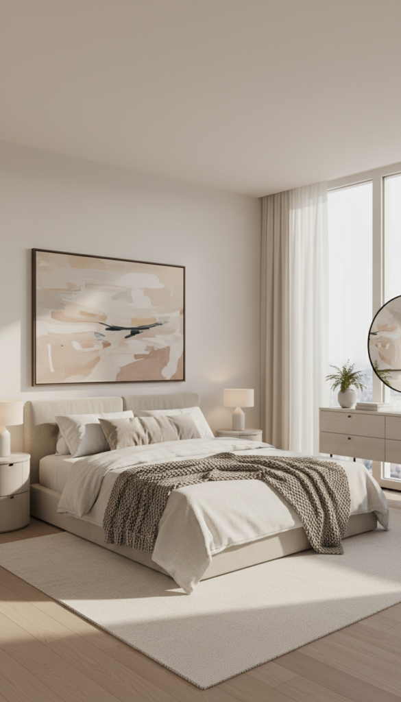 Neutral colors, clean lines, soft lighting, and thoughtful restraint work together to create a bedroom that supports rest and clarity.