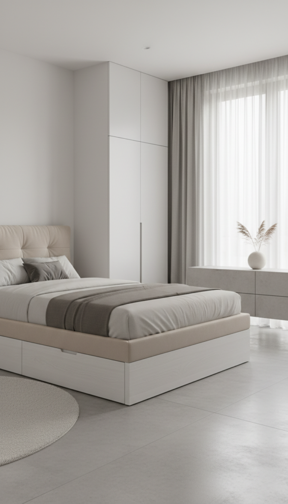Under bed drawers, closed wardrobes, and minimalist dressers keep everyday items out of sight.