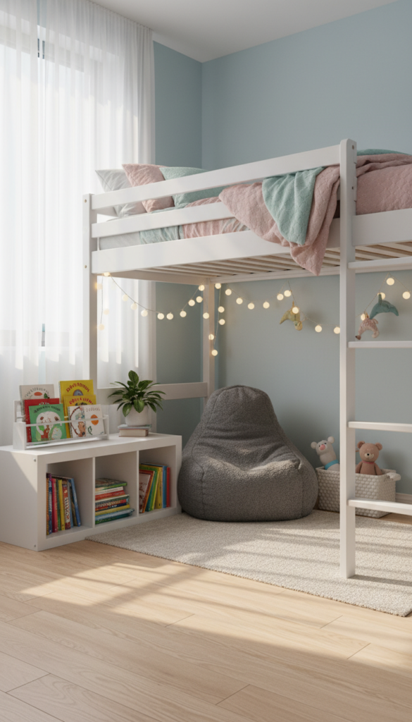 The bed usually takes up the most floor space in any bedroom. By elevating the sleeping area, you instantly reclaim the square footage underneath. A loft bed isn’t just for sleeping; it creates a dedicated “zone” below for a study desk, a cozy reading nook with bean bags, or even a play fort. Look for frames in light wood or white metal to keep the visual weight light and airy.