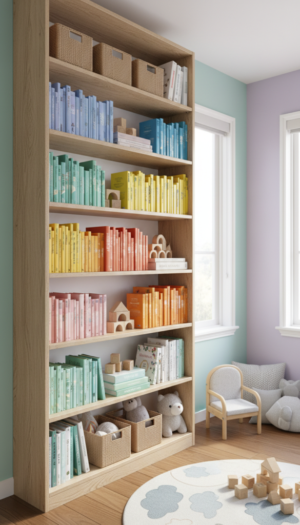 When you can’t build out, build up. Tall, narrow shelving units draw the eye upward, creating the illusion of higher ceilings while offering maximum storage. Open shelving allows you to display colorful toys and books as decor, while the lower shelves can house woven baskets to hide unsightly clutter like cables or miscellaneous gadgets.