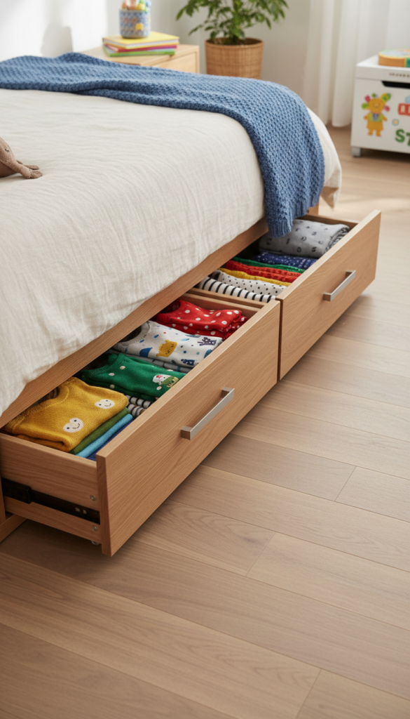 If a loft bed isn’t an option, maximizing the space under a standard bed frame is crucial. Instead of shoving plastic bins underneath, opt for aesthetic rolling drawers made of wood or rattan. These blend seamlessly with the furniture and provide easily accessible storage for seasonal clothes, extra bedding, or building blocks.