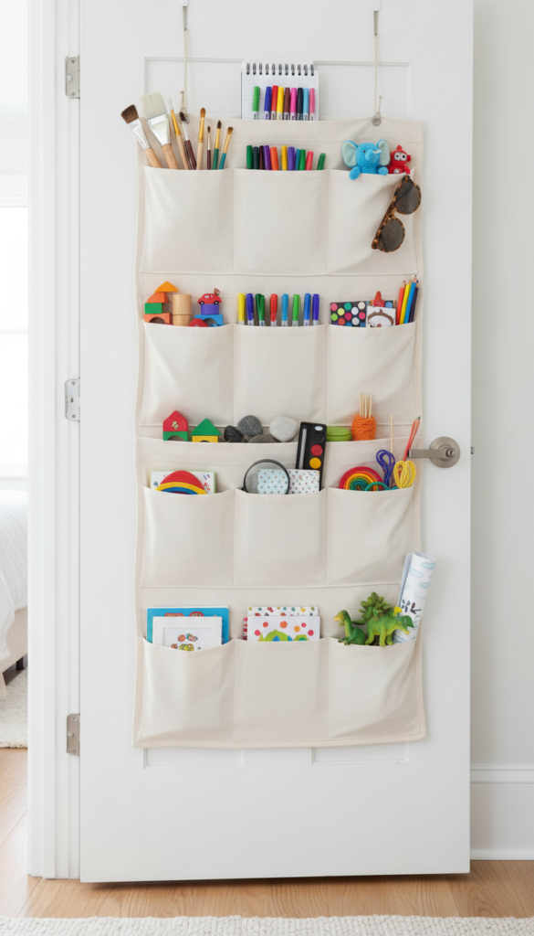The back of the bedroom door is prime real estate often left unused. Modern over-the-door organizers have graduated from cheap plastic shoe holders to stylish canvas or linen pockets. These are perfect for storing smaller items like action figures, art supplies, or accessories, keeping them off the floor but within easy reach.
