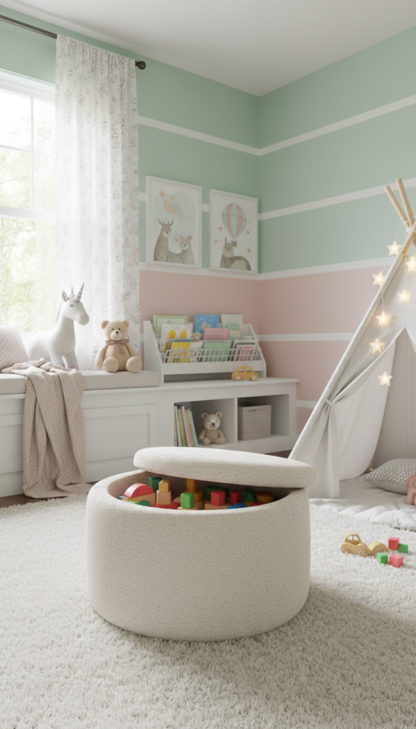 Every kid’s room needs seating, but in a small space, furniture must multitask. Swap out standard chairs for storage ottomans or hollow poufs. These provide a comfy place to sit and a secret compartment to stash video games, blankets, or costumes. Choose fabrics like velvet or boucle to add texture and warmth to the room.